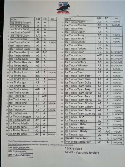 HD ED Ice Tindra hundaHér koma niðurstöður úr mjaðma og olnboga myndun á Ice Tindra hundum og innfluttum hundunum okkar og höfum við bætt inn í DM niðurstöður.